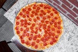 A thin crust round pie with homemade tomato sauce, grand mozzarella, shredded parmigiana cheese, domestic pepperoni.